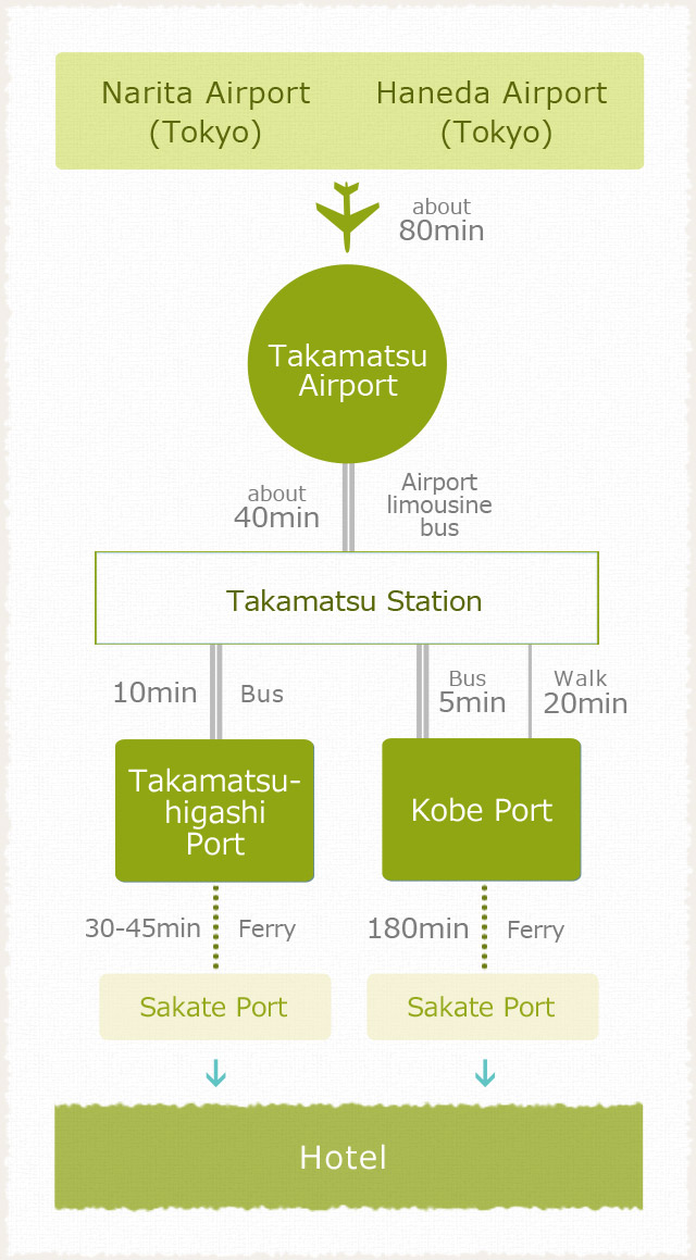 途中虽然需要坐船,但在高松、宇野、冈山、姬路、日生、神户港口有众多可前往小豆岛的乘船码头,从本州前往小豆岛非常方便。